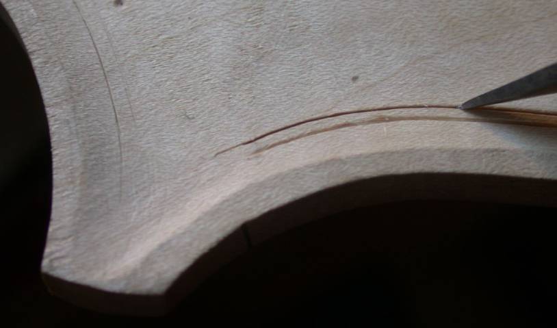 Der Einlagespan oder auch die Ader genannt wird bei einer Geige, Bratsche, Cello und Bass wie eine Intarsie in die Decke eingepasst. Um den Graben für die Einlage in den Korpus zu bekommen nutzt der Geigenbauer ein Werkzeug mit einem seitlichen Anschlag und zwei parallel liegenden Messern. Dem sogenannten Adergrabenschneider. Diese angeritzten Linien werden anschließend mit dem Schnitzer vertieft, um anschließend mit dem Adergrabenausheber das Holz in dem Zwischenraum zu entfernen.