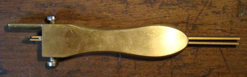 Der Abstand der parallel liegenden Messer zum seitlichen Anschlag kann durch 2 Schrauben verstellt werden. Hierdurch hat der Geigenbauer die gestalterische Möglichkeit, den Span weiter in die Hohlkehle oder zum Rand hin einzulassen.