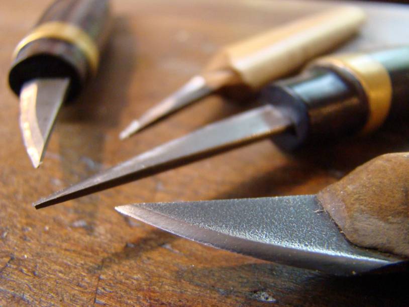 Das am häufigsten benutzte Werkzeug im Geigenbau ist wohl das Schnitzmesser. In der Regel fertigt der Geigenbauer das Schnitzerheft selber an, damit es gut in der Hand liegt.
