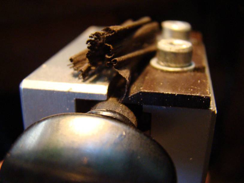 Der Wirbelschneider funktioniert im Prinzip wie ein Bleistiftanspitzer. Der Wirbel wird solange abgedreht, bis er gleichmäßig rund läuft.