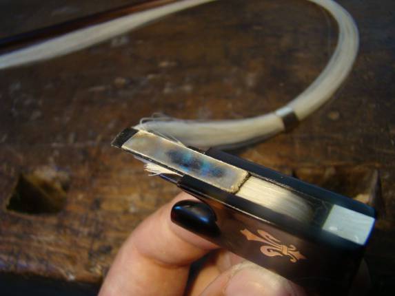 Besonders vorsichtig musste hier herangegangen werden, da bei dem Geigenbogen der Frosch bereits mehrfach gebrochen war.