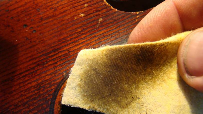 Gerade bei etwas weicheren Lacken kann es vorkommen, dass sich Kolofonium und Staubpartikel auf dem Lack festsetzen. Hier gibt es verschiedene Lackpflegemittel, die im Handel angeboten werden. Das auf der Abbildung benutzte Miracle Reinigungstuch ist insofern zur reinen Schmutzentfernung gut, da es den Lack nicht angreift und auch keine weiteren Bestandteile enthält, die das Instrument auf Hochglanz bringen. Die bekannten Polier- und Pflegemittel, wie z.B. Viol, Hill, Aureol oder Bellacura sollten nur ab und zu benutzt werden, da die Wachsbestandteile, die das Instrument zum glänzen bringen, sich als zusätzliche Schicht auf dem Lack absetzen.