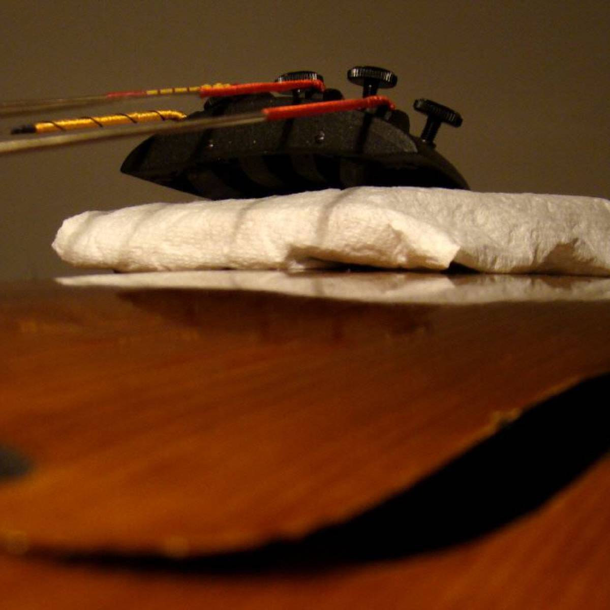 Legen Sie bitte unter den Saitenhalter ein Stück Stoff oder Küchenpapier. Es verhindert ein zerkratzen der Decke durch die Feinstimmer.