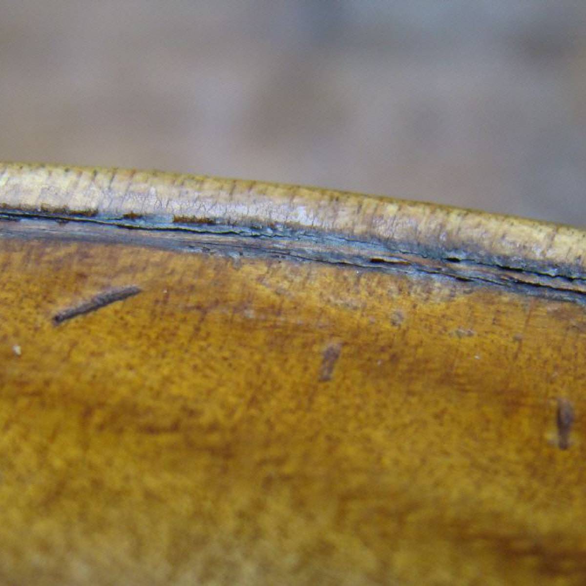 Gerade bei alten Instrumenten können sich Leimstellen im Adergraben lösen, so dass der Einlagespan nicht mehr ganz fest im Adergraben liegt. Durch die Schwingungen kann es hier zu erheblichen Klappergeräuschen kommen, die kaum zu orten sind. Erkennen lassen sich solche Stellen meist, wenn oberhalb des Einlagespans der Lack abgeplatzt ist. Für eine Reparatur ist der Weg in eine Werkstatt für Geigenbau unumgänglich.