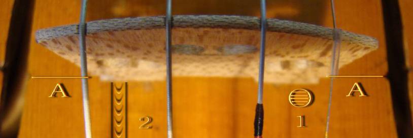 Die Position von Bassbalken (2) und Stimmstock (1) sind für die richtige Stegposition von entscheidender klanglicher Bedeutung. Der Geigenbauer sollte beim Aufpassen eines neuen Steges diese Positionen unbedingt beachten. Beide befinden sich ca. 3mm innerhalb der Stegfüße. Der Abstand des Stimmstocks vom Stegfuß in Richtung Saitenhalter beträgt 3-4 mm. Diese Einstellungen kann nur der Geigenbauer gegebenenfalls verändern.