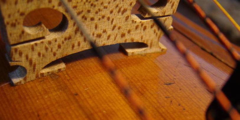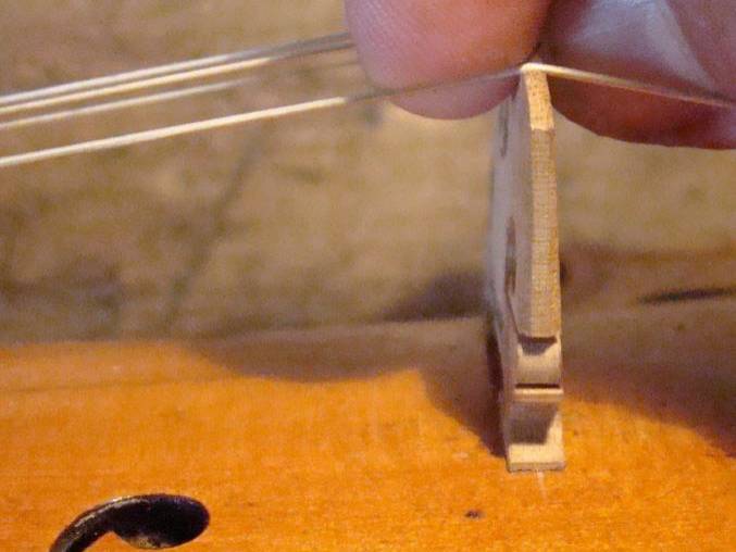 Die Rückseite des Steges sollte zur Grundfläche der Decke in einem Winkel von 90 Grad stehen. Auf dem Steg lastet bei einer Violine ein Saitendruck von etwa 8Kg und bei einem Cello von etwa 20kg.