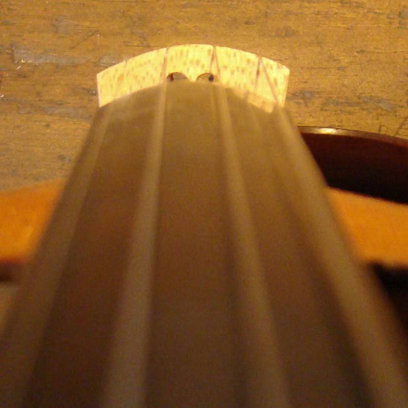 Ein häufiger Fehler wird gemacht, wenn die richtige Stegposition nur über das Griffbrett ermittelt wird. Wenn man über das Griffbrett peilt (siehe Bild rechts), steht der Steg normalerweise mittig zum Griffbrett. Wenn der Hals nun etwas schief eingeleimt ist stimmt diese Messmethode nicht mehr. Vorrang muß immer das Messen des akkustischen Zentrums (Position zum Bassbalken und Stimmstock) haben. Bei schief eingeleimten Hals sollte der Steg demnach schief zum Griffbrett stehen.