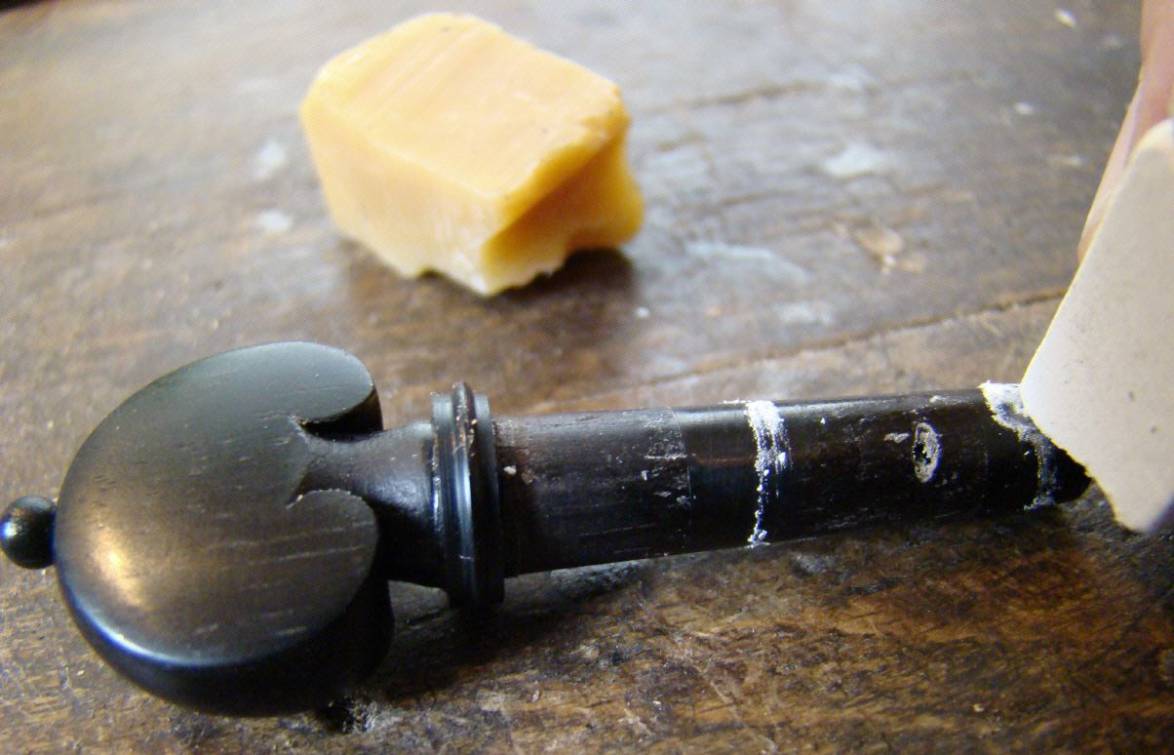 Ist der Wirbel gleichmäßig rund und hat überall Kontakt zu dem Wirbelkastenwänden, können Sie den Wirbel selber mit Kernseife und Kreide gängig machen. Reinigen Sie vorher den Wirbelschaft gründlich, z.B. mit Küchenpapier. |