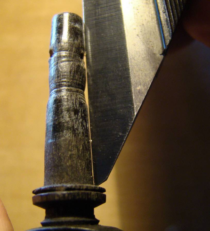 .....ob der Wirbel an den beiden Kontaktstellen einen gleichmäßigen Abdruck hinterläßt. Sollte das nicht der Fall sein, müssen Sie einen Geigenbauer aufsuchen, der mit einem Wirbelschneider den Wirbelschaft begradigt.