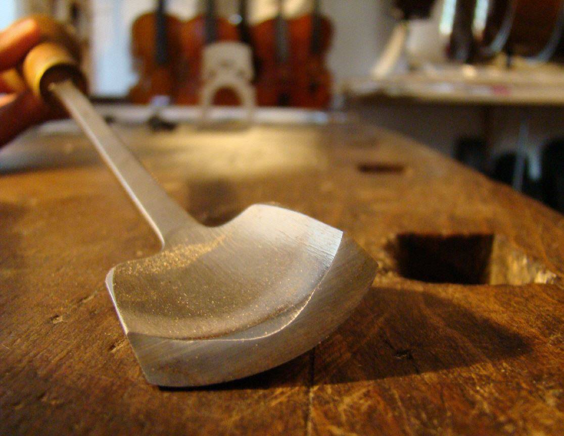 Dieses Stemmeisen wird im Geigenbau genutzt, um beim Neubau die Decke, bzw. Boden von Geige, Bratsche, Cello oder Bass grob zu Wölben. Es handelt sich um ein leicht gekröpftes Stemmeisen mit Innenanschliff.