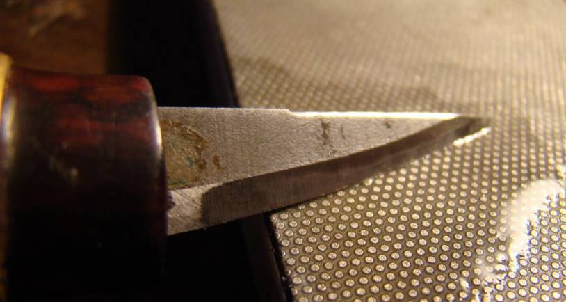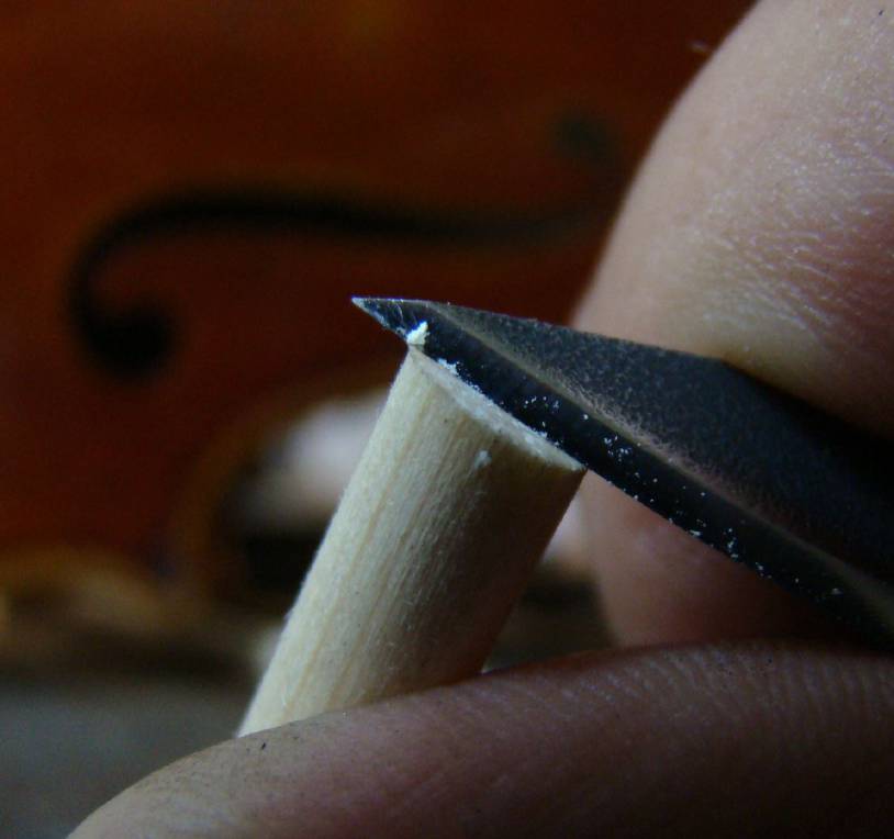 Das am häufigsten benutzte Werkzeug im Geigenbau ist wohl das Schnitzmesser. In der Regel fertigt der Geigenbauer das Schnitzerheft selber an, damit es gut in der Hand liegt.