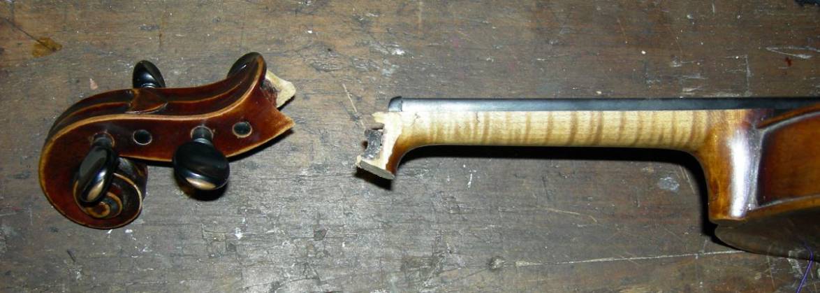 Durch einen Sturz der Geige löste sich im hinteren Bereich der Anschäfter und brach dann heraus.