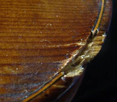 Durch Herunterfallen der Geige auf einen Gegenstand sind bei dieser Violine der Deckenrand und der Einlagespan herausgebrochen. Die obere Deckenecke der Diskantseite war stark abgenutzt und einStück Holz war herausgebrochen. |