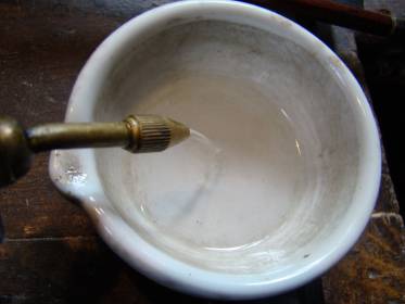 Um die Bogenhaare auszuwaschen wird ein kleiner Napf oder eine Untertasse mit Alkohol oder Brennspiritus (Menge: etwa ein gut gefülltes Schnapsglas) gefüllt. Brennspiritus erhält man in jeder Drogerie. |