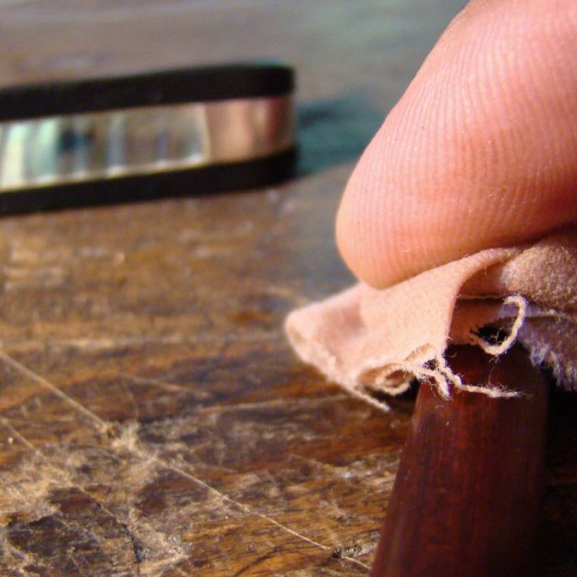 Nach dem Reinigen mit dem Pflegemittel sollten Sie die Bogenstange mit einem sauberen Tuch nachwischen. So vermeiden Sie, dass Öl an die Haare gerät.