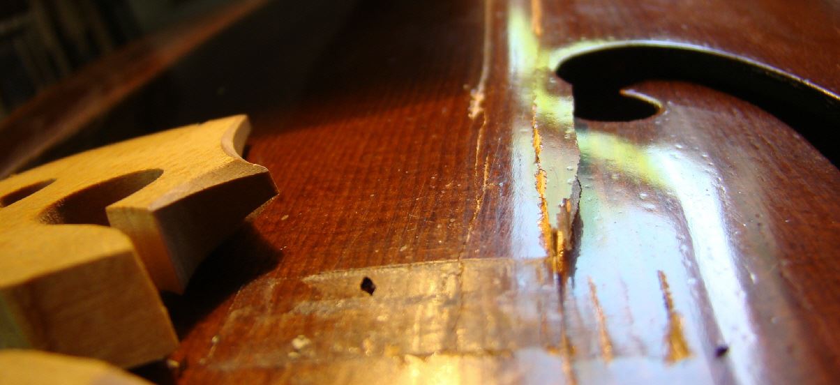 Gerade bei Rissen die sich im Bereich des Saitenhalters, Steges und des Griffbrettes befinden, muss aufgrund der Spannungsverhältnisse die Decke geöffnet werden und der Riss belegt werden. Bei F-Klappenrissen oder solchen, die ganz am Rand liegen ist eine solche aufwändige Reparatur nicht immer notwendig. Suchen Sie jedoch baldmoglichst einen Geigenbauer auf. Reinigen Sie nach dem Entdecken eines Risses auf keinen Fall das Instrument. Schmutz könnte die Bruchstellen verunreinigen.