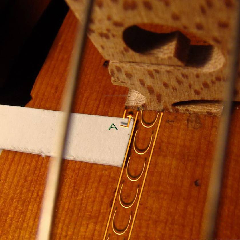 Für den Klang eines Instrumentes ist es von entscheidender Bedeutung, in welcher Position der Steg zum Bassbalken und Stimmstock steht. Um diese Maße zu überprüfen, kann man sich eine Bassbalkenlehre aus einem dünnen Karton selber bauen.